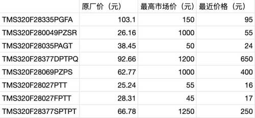 可以看到,这8颗料号中,大部分型号价格已经回落至常态价附近,甚至F28035、F28335、F28027出现了市场价低于原厂价的倒挂现象。不过有个别型号价格依旧坚挺,F28377DPTPQ、F28069和F28377SPTPT仍有着5-6倍的涨幅。